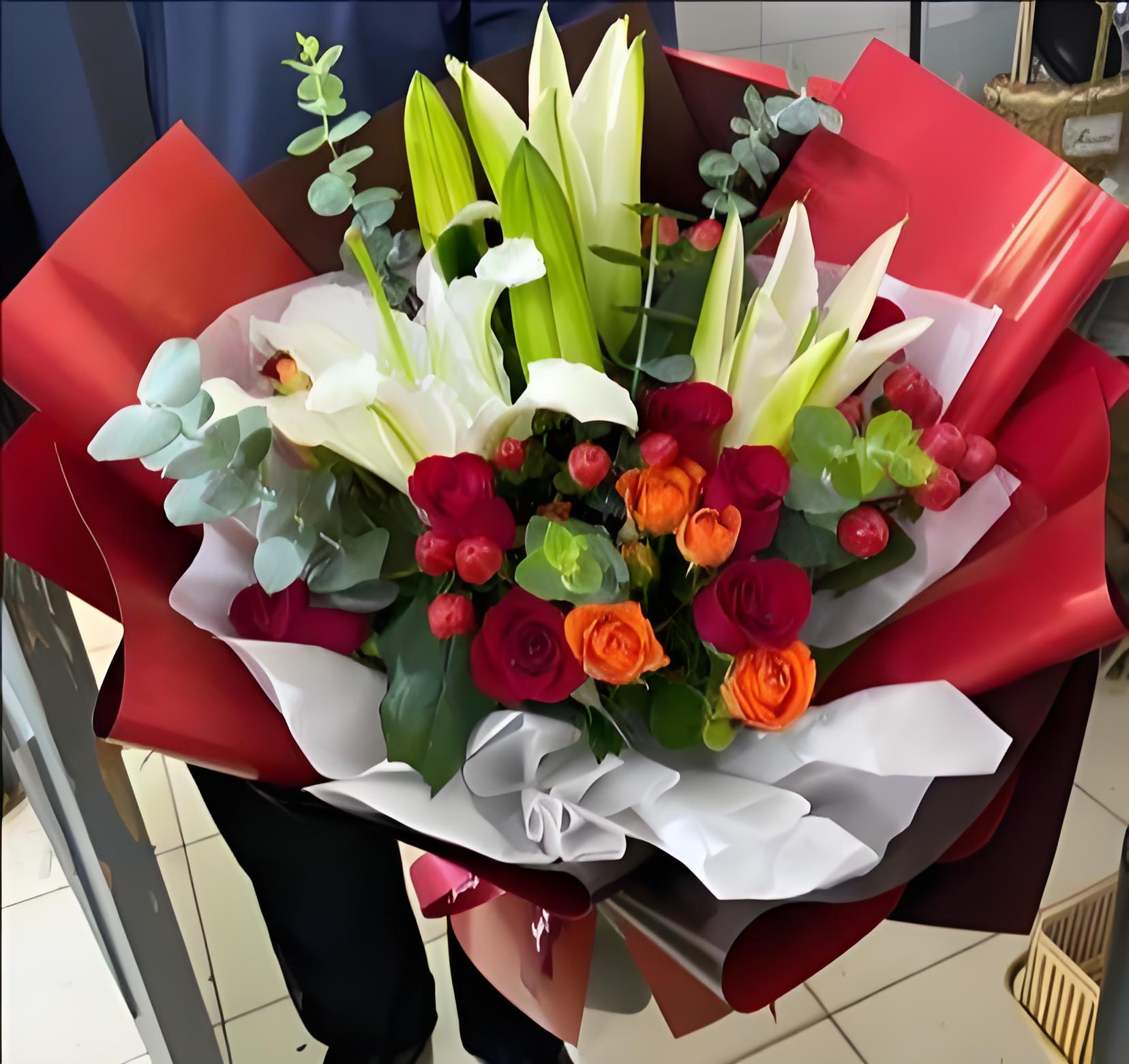 汕头南澳县花店包11枝红玫瑰、2枝多头白百合、6枝橙色多头玫瑰、红豆、尤加利叶包装:酒红色包装纸扇形包